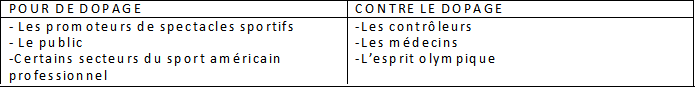les contrôleurs – Le public – Les médecins – Les promoteurs de spectacles sportifs- Certains secteurs du sport américain professionnel – L’esprit olympique.