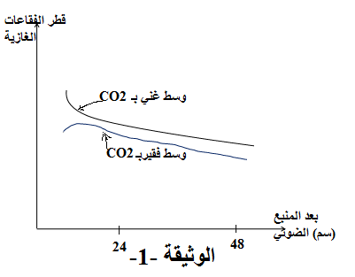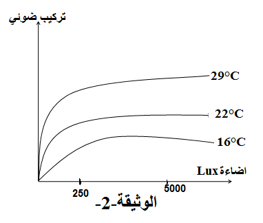 2. بعد دراسة تأثير كل من الضوء والحرارة على شدة التركيب الضوئي عند نبات الايلوديا تم انجاز منحنى الوثيقة (2).