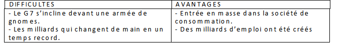 Entrée en masse dans la société de consommation- Le G7 s’incline devant une armée de gnomes. Des millions d’emplois ont été créés. Les milliards qui changent de main en un temps record.