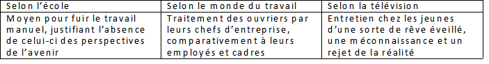 - Moyen pour fuir le travail manuel, justifiant l’absence de celui-ci des perspectives d’avenir.