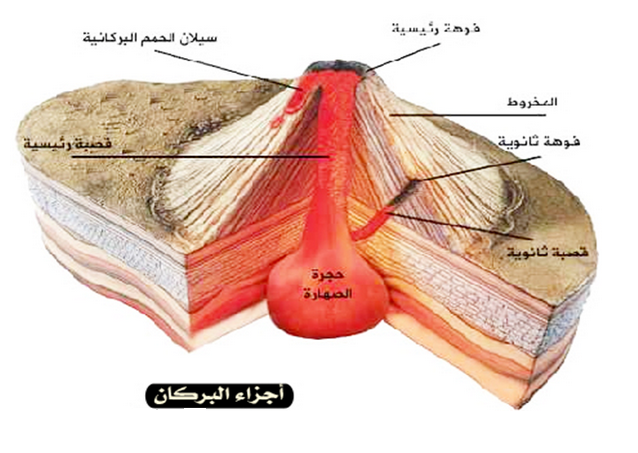 - الفوهة cratere : فتحة على شكل قمع تعلو المخروط تكون عموما مركزية و يمكن أن تتواجد فوهات ثانوية جانبية ومنها تنبعث المقذوفات البركانية المختلفة .