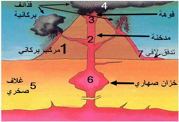 - cheminée volcaniqueالمدخنة : تجويف اسطواني يخترق القشرة الأرضية ليصل بالأعماق الباطنية حيث تكون الصخور في حالة انصهار (الماغما ) ويبلغ طولها عدة كيلومترات .