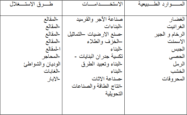 يستغل الانسان الموارد الطبيعية المعدنية والنباتية التي تشكلت خلال الازمنة الجيولوجية الطويلة لأغراض متعددة كالبناء – الصناعة –والفلاحة مما نتج عنه تغير في المناظر الطبيعية وتلويث البعض منها وذلك بسبب الاستغلال المفرط لهذه الموارد .