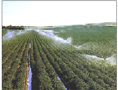 حيث يرش الماء فوق المزارع ومن أشهرها الري المحوري الذي اعتمد في الصحراء وسمح بتحويل مساحات شاسعة من الصحراء إلى مزارع خصبة حققت مردودا معتبرا في ميدان زراعة الحبوب.