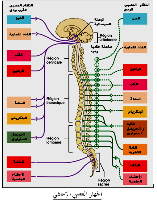 * الجهاز العصبي الودي حيث المراكز العصبية تقع في المناطق الرقبية و الظهرية و القطنية للمادة الرمادية من النخاع الشوكي .