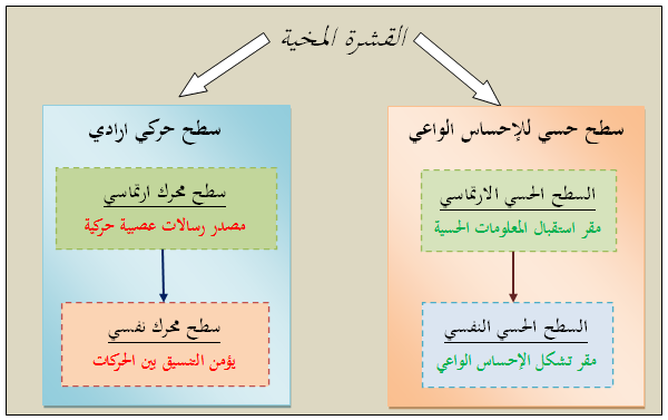 - تتوزع السطوح الحسية في القشرة المخية حيث لكل حاسة سطح خاص يتكون من سطح ارتسامي او اسقاط للسيالات الحسية و سطح نفسي او ادراك للإحساس .