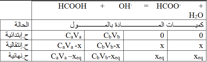 ننمذج التحول الكيميائي الذي يحدث بين حمض الميثانويك و الماء بالمعادلة الكيميائية التالية: