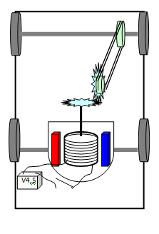 عند غلق القاطعة يتولد حقل مغناطيسي حول الوشيعة , وبوجود الحقل المغناطيسي المتولد عن المغناطيس تنشأ قوة كهرومغناطيسية تؤدي إلى دوران الوشيعة فيدور المسنن الأول ويدير المسنن المتشابك معه فتنتقل الحركة إلى الدولابالموجود على محور العجلتين بواسطة السير المرن , فتدور العجلتين وتتحرك السيارة.