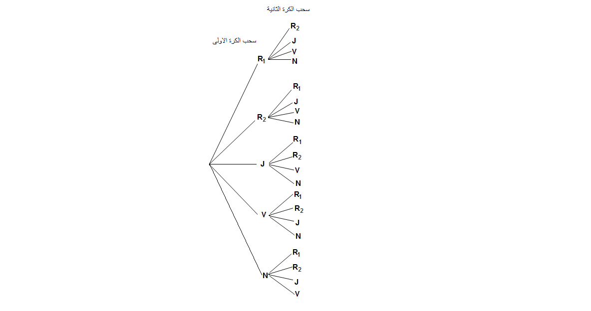 نسحب كرة واحدة من العلبة بصفة عشوائية و نسجل لونها و لا نرجعها الى العلبة ثم نسحب كرة ثانية و نسجل لونها