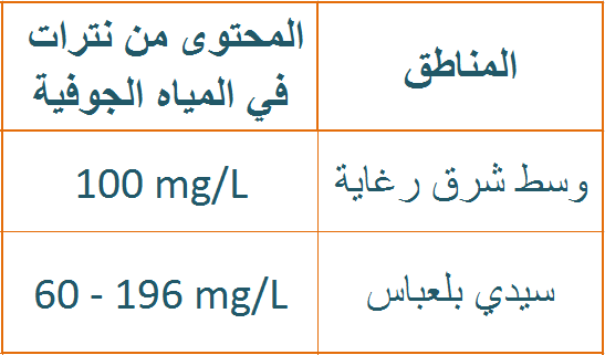تمثل الوثيقة (03) محتوى المياه الجوفية من النترات في المنطقتين من الجزائر، بينما تمثل الوثيقة (04) تطور كمية النترات في أحد المنابع المائية القريبة من المزارع المستعملة الأسمدة الأزوتية.