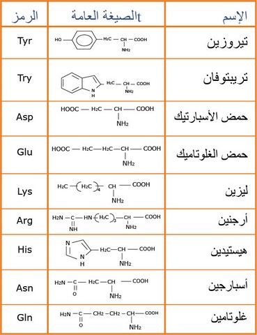 الأحماض الأمينية هي مركبات عضوية صيغتها العامة موضحة في الوثيقة (2) كما بينت التحاليل الكيميائية الخاصة بنوع الأحماض الأمينية المكونة المكونة للبروتينات وجود 20 نوع من الأحماض الأمينية موضحة في الوثيقة (3).