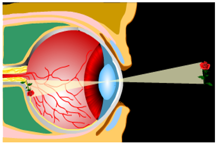إن العين باستخدام العدسة الموجودة فيها تقوم بتكوين صورة مشابهة على الشبكية، حيث ينعكس الضوء عن الجسم ويدخل في العين من خلال القرنية إلى السائل المائي، ثم يمر من البؤبؤ إلى العدسة، التي تكون خيالاً للجسم على الشبكية، ثم ينقل العصب البصري الإحساس بهذا الخيال إلى المراكز العصبية في الدماغ الذي يميز الأجسام التي نراها، وهكذا تتم الرؤية.