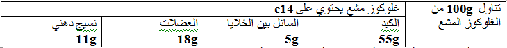 يظهر الجدول التالي تمركز الإشعاع في الجسم بعد تناول 100 غ من الغلوكوز المشع