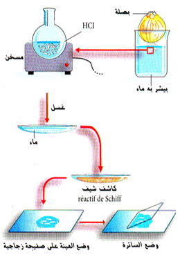 2. اقطع نهايات الجذور بطول 1سم وضعها لمدة  15 دقيقة في حوجلة بها حمض كلور الماء °60 ثم  اغسله بالماء