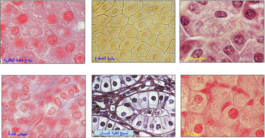 - تظهر الملاحظة وجود خلايا مفلطحة على شكل كتل ملتصقة مع بعضها العض او منفصلة تتكون كل واحدة من مادة أساسية محببة هي الهيولى تحاط بغشاء رفيع هو الغشاء الهيولي يوجد في مركز كل خلية كرية كاسرة للضوء هي النواة.