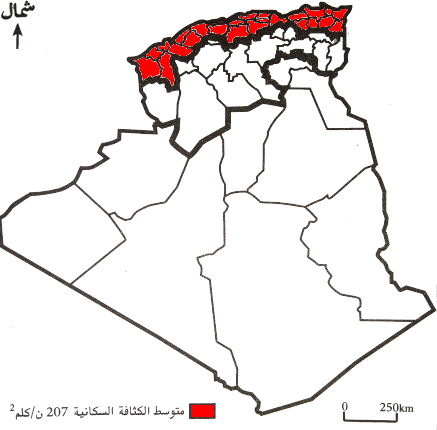 بحيث تقلّ عن 10 نسمة في الكلم² باستثناء الواحات و المراكز الصّناعيّة و يعود هذا الإنخفاض إلى صعوبة الظّروف الطّبيعيّة و خاصّة المناخيّة منها.